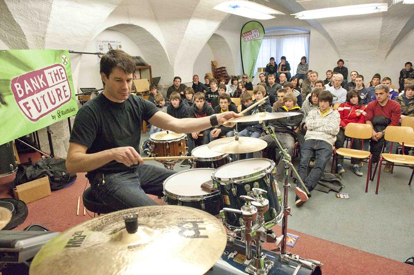 Johnny ist seit Jahren MEINL-Becken-Endorser und beeindruckte mit seinen modernen, frischen Drum-Grooves sämtlichen Workshop-Teilnehmer. Von Drum & Bass und Jungle-Grooves bis Double-Bass-Drum-Grooves reichte die umfangreiche Palette und so konnte jeder Teilnehmer etwas von diesem Schlagzeug-Nachmittag mit nach Hause nehmen. Natürlich demonstrierte Johnny, der heute in Chicago lebt, seine "Freehand-Techique" und sorgte dabei für Erstaunen und Anerkennung bei den rund 75 Workshop-Teilnehmern (davon neun Bank the future-Kunden und auch vielen Mitgliedern des Schlagzeugervereins).